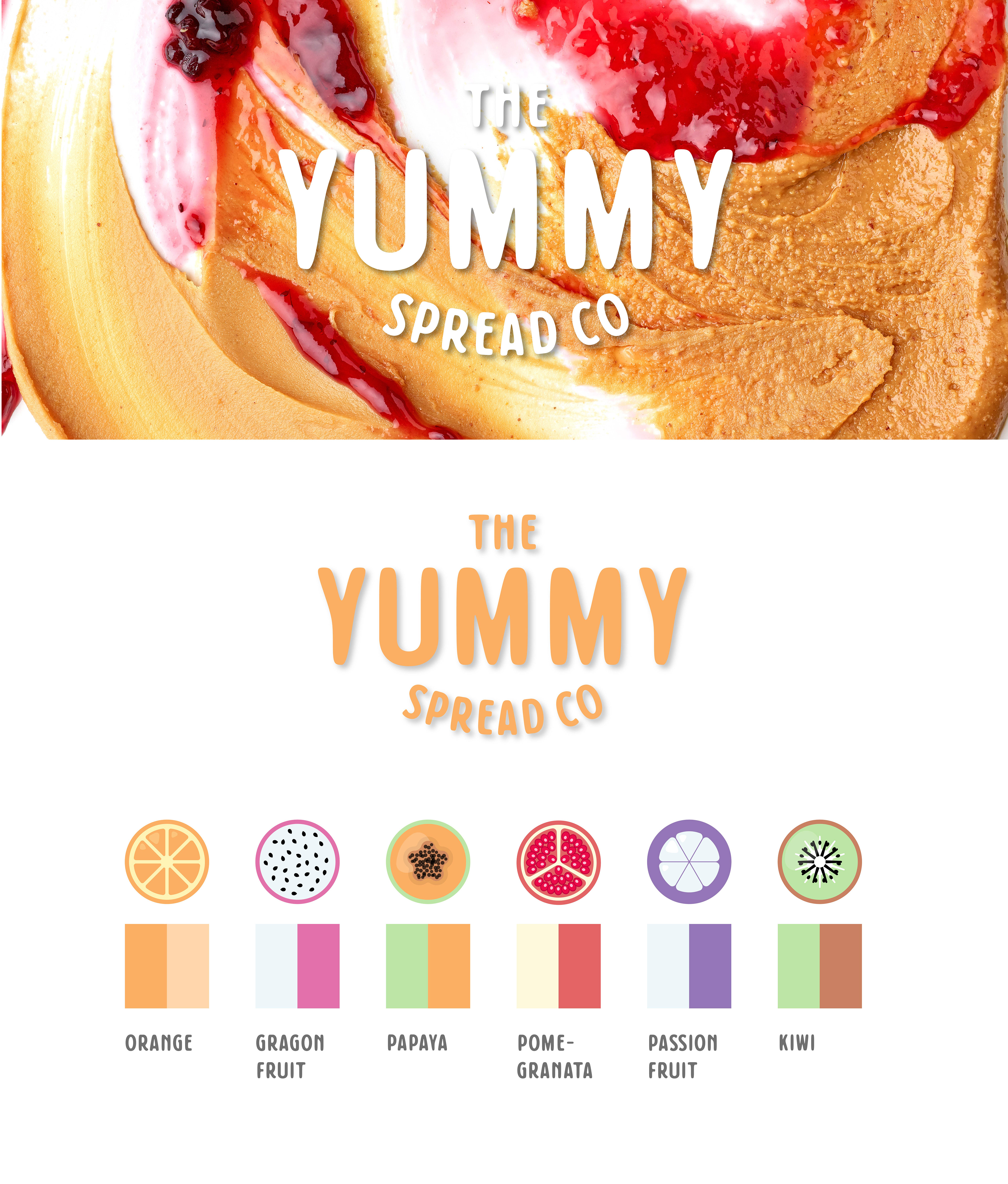 Para hacer este diseño THE YUMMY SPREAD CO me inspire en las frutas orgánicas que dicha marca presenta en sus productos. Combinando tipografía, colores y formas logré realizar un packaging personalizado para cada sabor, además de publicidad en vía pública!